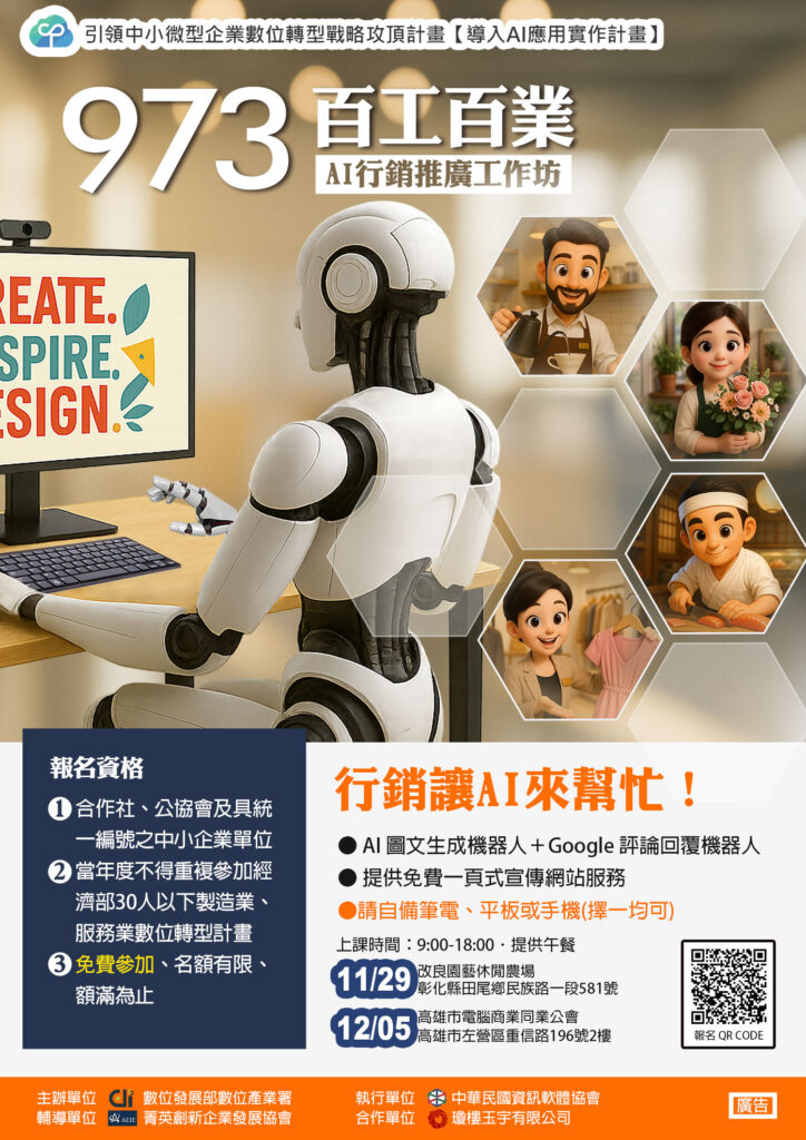 114年 引領中小微型數位轉型戰略攻頂計畫 導入AI應用實作計畫— 973百工百業 ‧ AI行銷應用工作坊